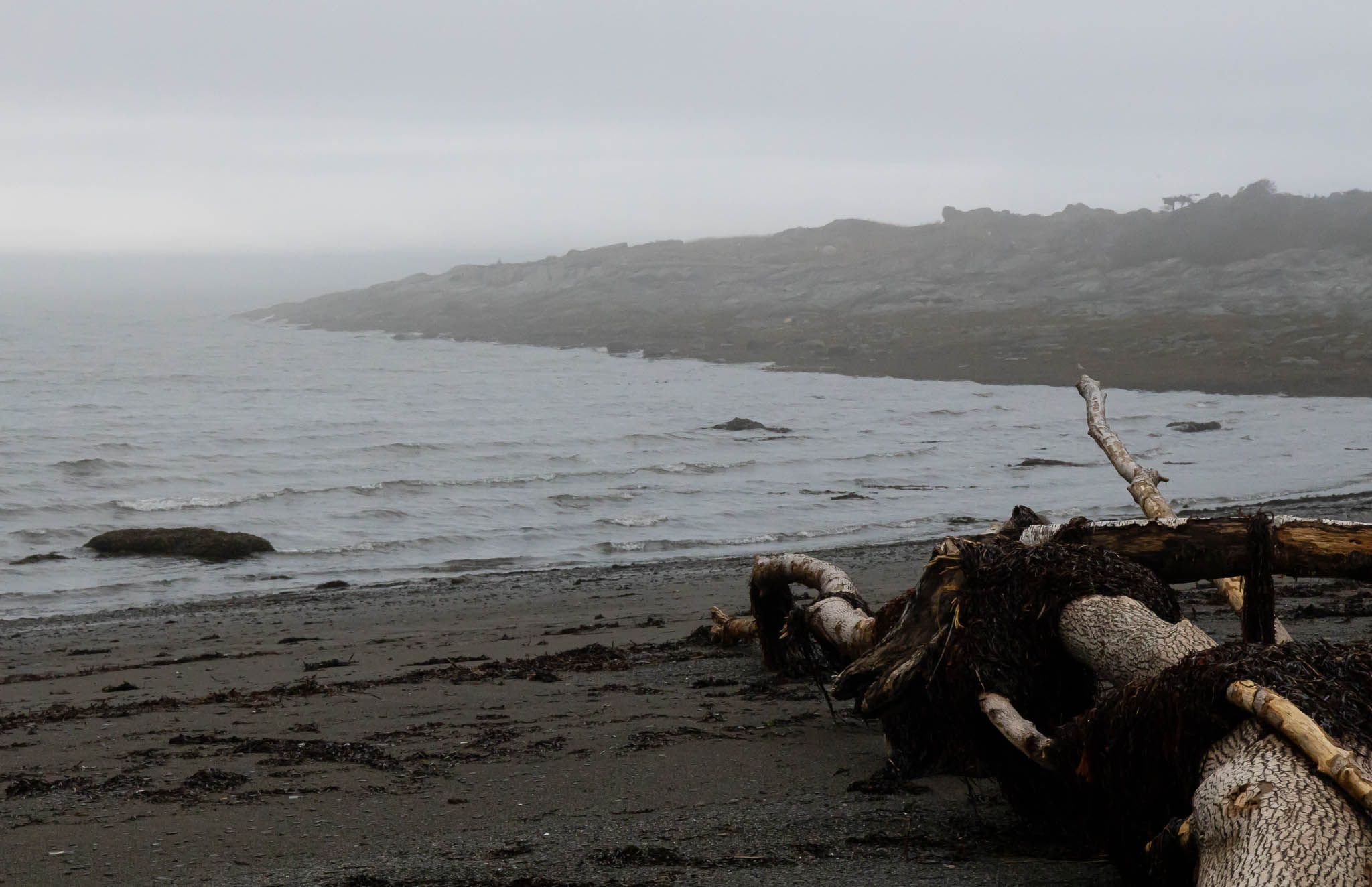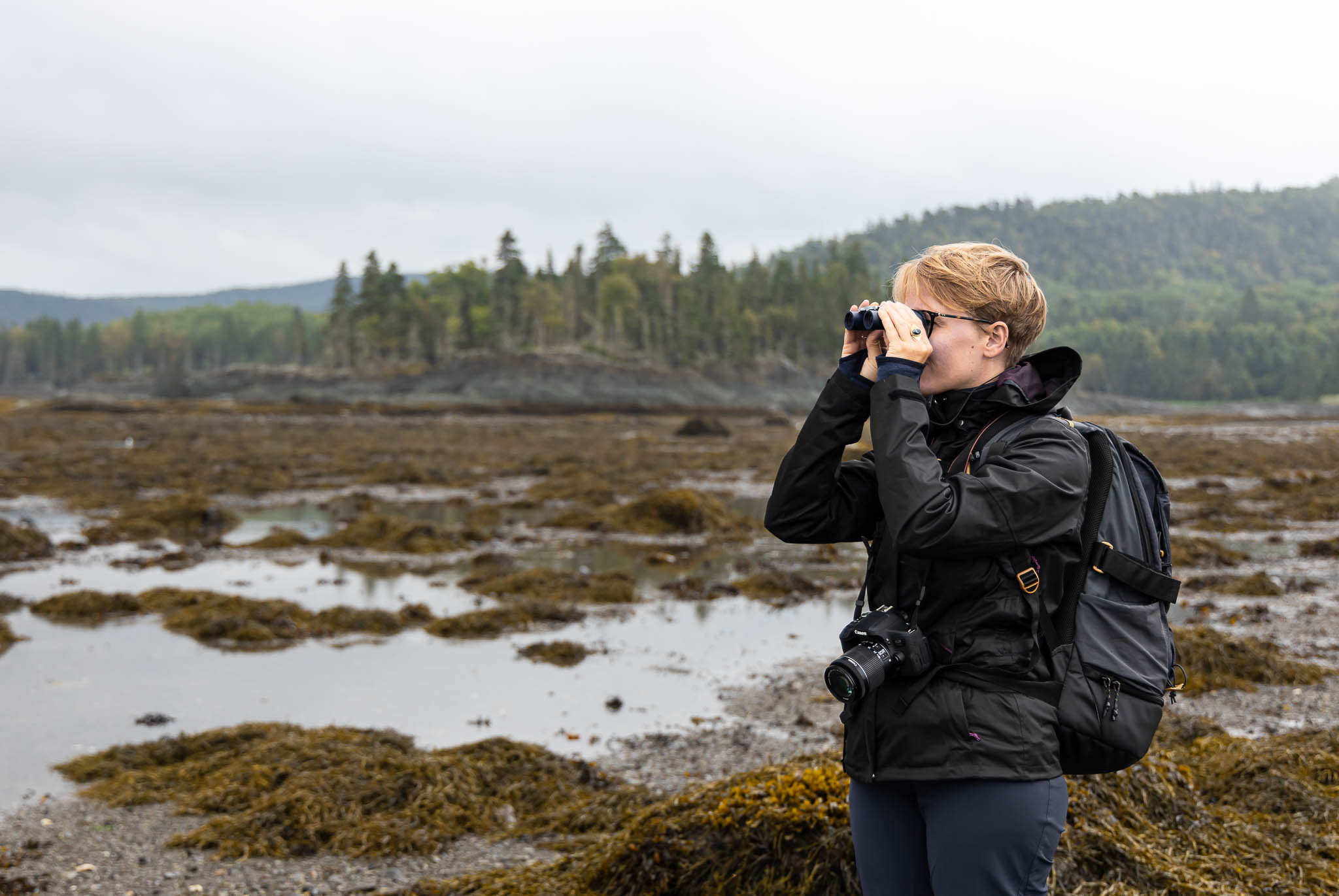 Très rapidement dans notre voyage, la météo s’est amusée à nous tapoter le visage avec son rire de pluie. Autrement dit, nous nous fîmes joyeusement chier dessus par le ciel pendant 90% de l’aventure. Mais bien heureusement, pour cette première journée de vadrouille pluvieuse, je n’avais prévu de n’amener ma douce amie que sur des petits sentiers connus et sympathiques. À l’entrée du Parc du Bic, on nous a d’ailleurs gentiment déconseillé de faire le « grand tour », car glissant. Ça tombe bien madame, c’est pas prévu. PENSES-TU, JEANNINE.